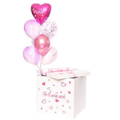 Также в данный набор из шаров Вы можете добавить свой подарок, мы просто разместим его внутрь коробки. Когда коробка будет открываться, из нее поднимутся в воздух шары с гелием, а внутри коробки останется лежать подарок от Вас!