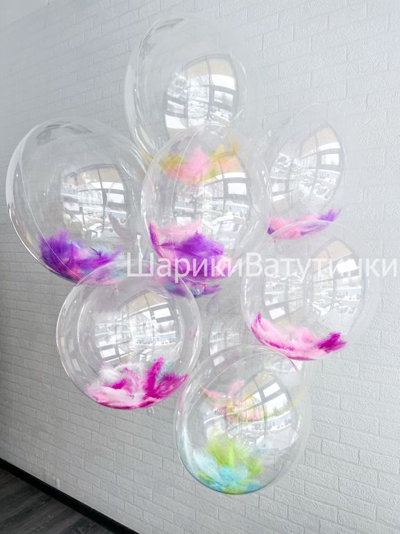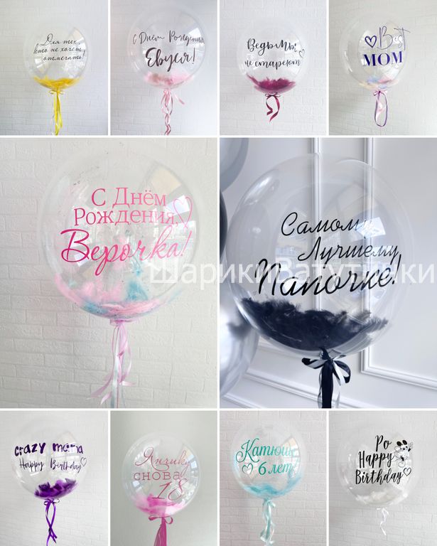 Шар баблс с перьями внутри и индивидуальной надписью смотрится стильно, как в одиночестве так и в композициях.