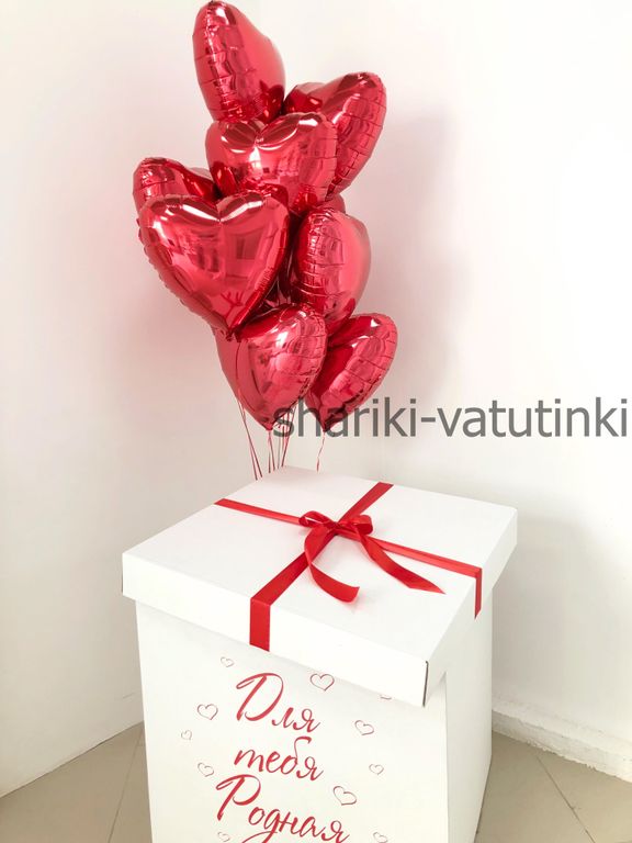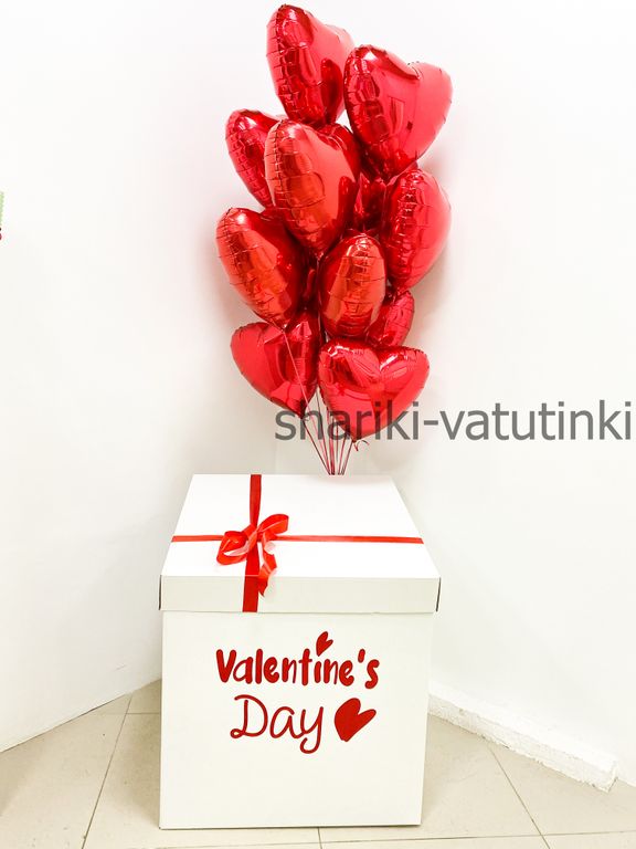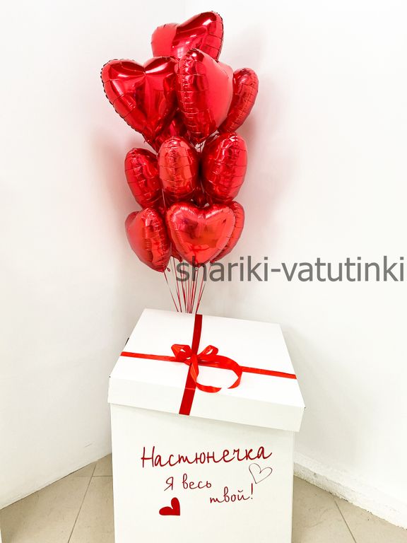 В коробке фонтан из 13 фольгированных красных сердец.