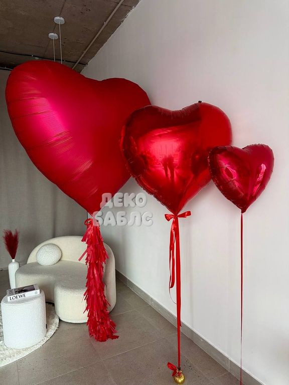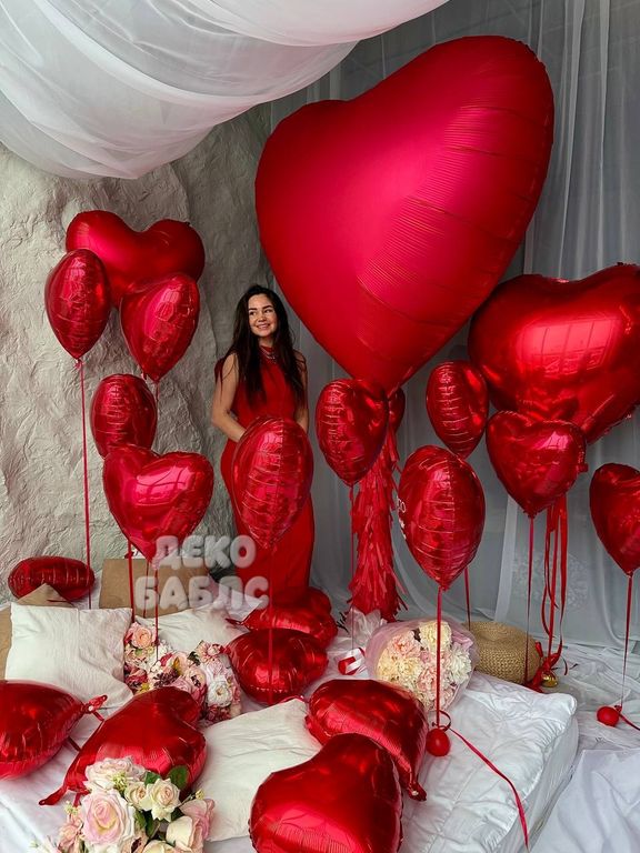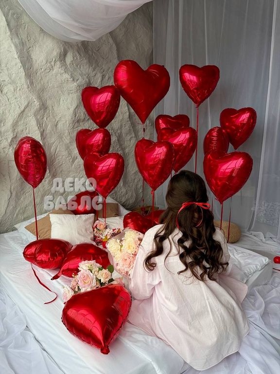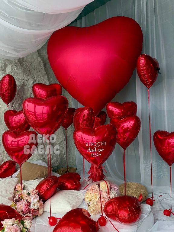 Оформление комнаты: Большой сет из красных шаров сердец под потолок и на пол