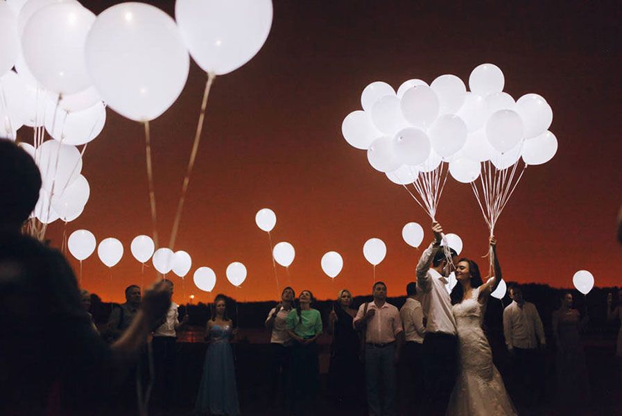 Светящиеся гелиевые шарики часто размещают под потолком в полумраке, а также запускают их в ночное небо по окончании торжества.