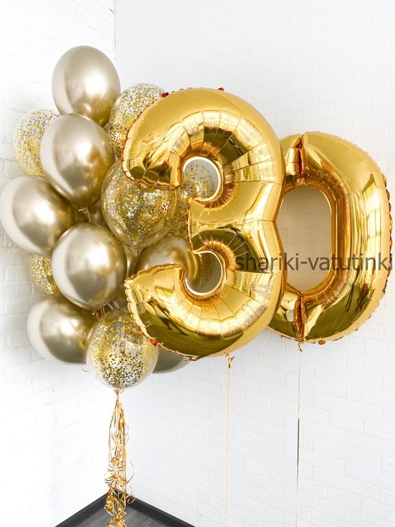 - фонтан из 25 шаров (8 с конфетти золото, 17 хром золото).