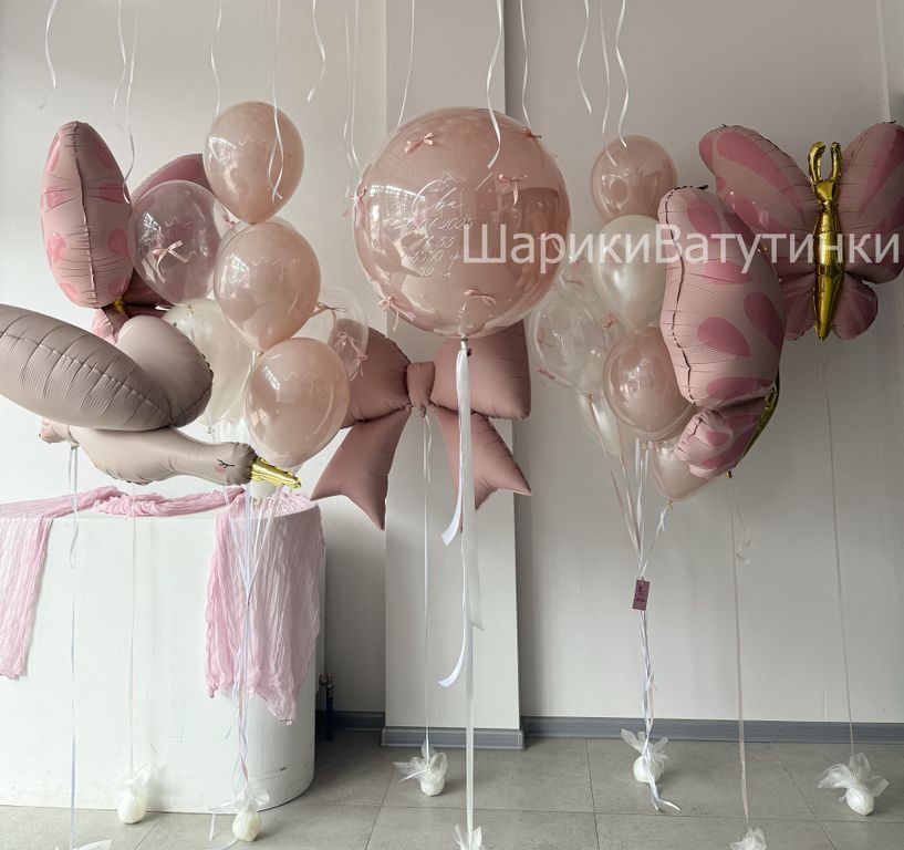 - два фонтана по 10 шаров с бантиками (3 прозрачных, 3 металлик, 4 даблстафф).