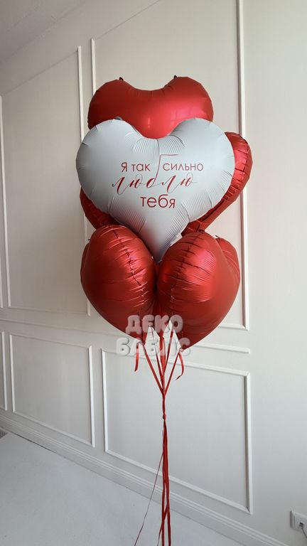 Изысканная композиция из глубоких красных сердец и акцентного белого шара с нежным признанием, надутых гелием для вашего праздника в Новой Москве.