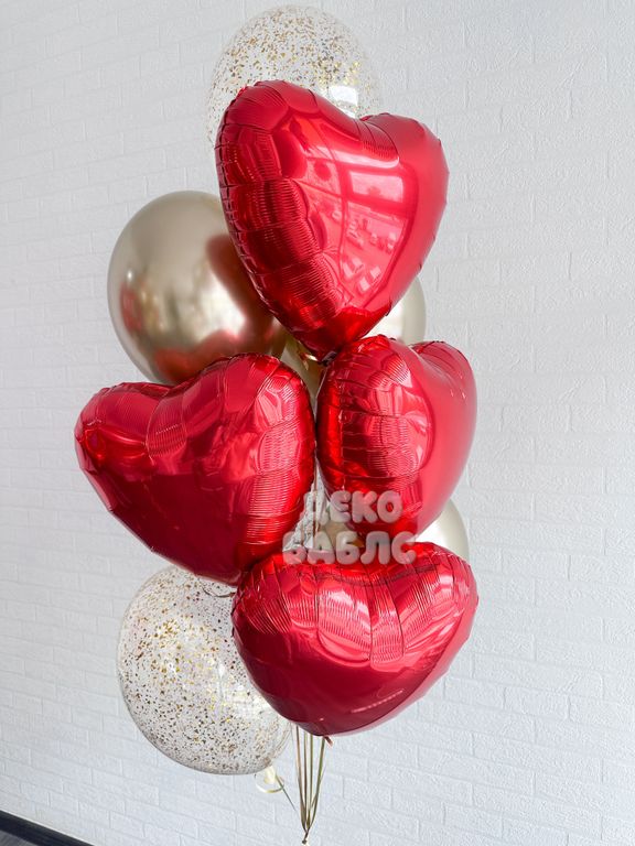 Фонтан шаров красные сердца и шары с конфетти золотые