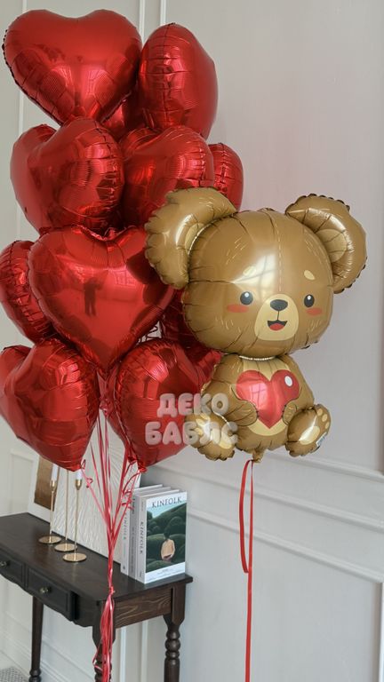 - 1 большой фигурный шар "Медвежонок с сердцем"