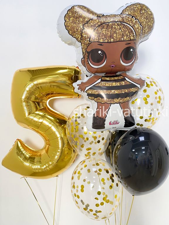 - фонтан из 6 шаров (Лол, 3 шара с конфетти, 2 шара без рисунка).