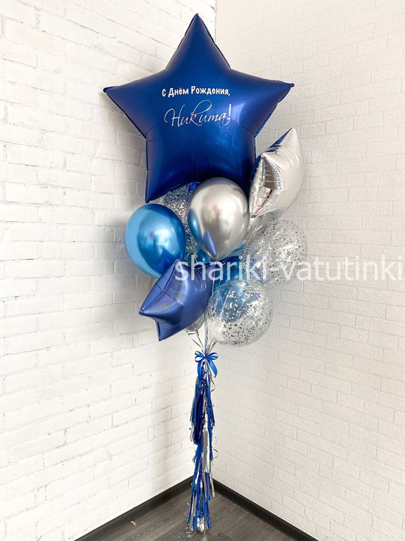 - фонтан из 15 шаров (звезда гигант с надписью, 2 звезды, 9 хром, 3 с конфетти).