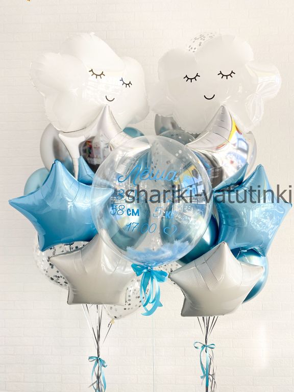 - два фонтана по 11 шаров (облако, 3 звезды, 3 с конфетти, 4 хром).
