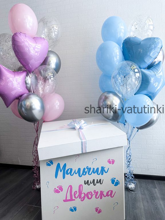 - коробка сюрприз 60см с надписью и бантом, внутри 40 мини шариков розовые или голубые;