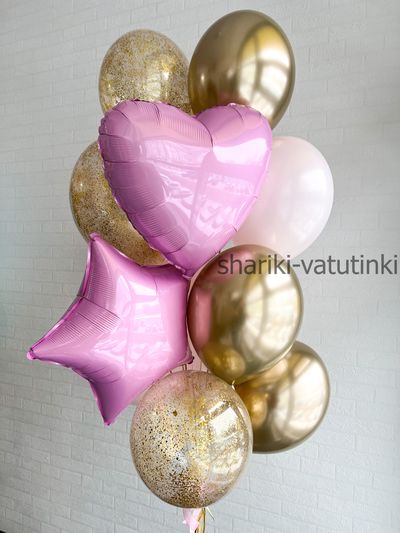 - фонтан из 12 шаров (сердце, звезда, 3 хром, 3 с конфетти, 4 однотонных).