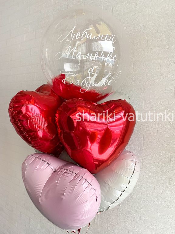 - фонтан из 7 шаров (баблс с перьями и надписью, 6 сердец).
