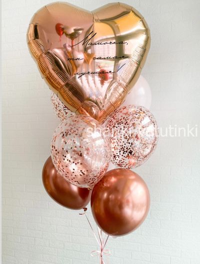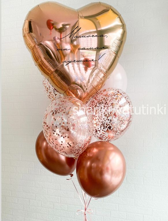 - фонтан из 9 шаров (сердце гигант с надписью, 3 с конфетти, 2 хром, 3 однотонных).