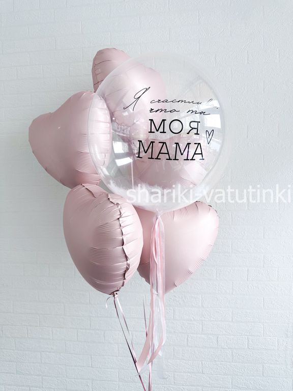 - фонтан из 6 шаров (шар баблс с перьями и надписью, 5 сердец).