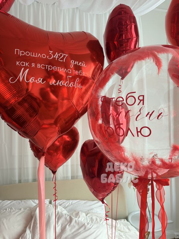 - прозрачный шар баблс с красными перьями и с индивидуальной надписью;