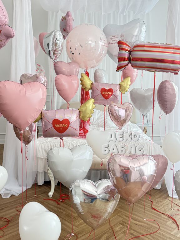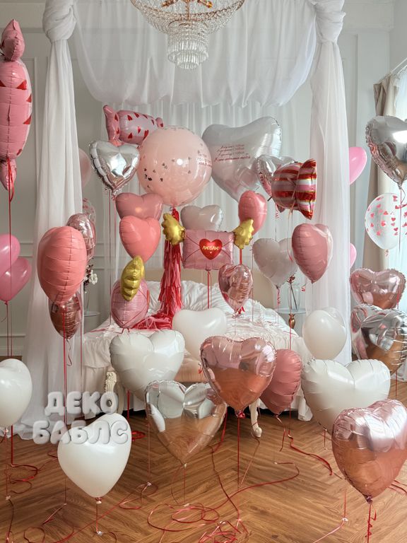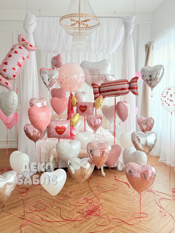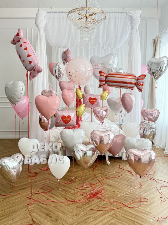 Оформление комнаты шарами "Нежное признание" (розовые и серебряные сердца)