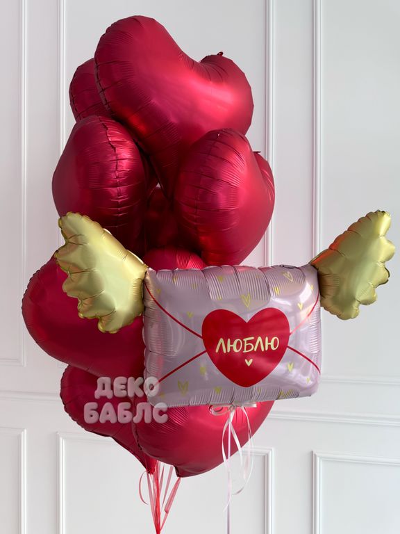 Очаровательная композиция из парящих алых сердец и милого шара-конверта с золотыми крыльями, созданная для самого нежного признания в чувствах.