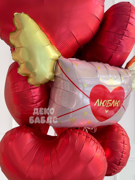 - фонтан из больших фольгированных сердец сатин люкс 10шт и фольгированной фигуры конверт письмо с крыльями "Люблю".