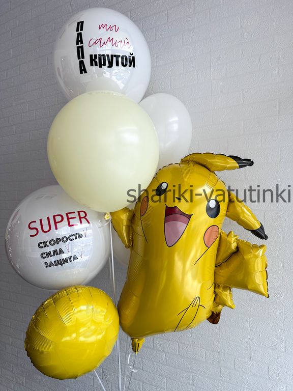 - фонтан из 7 шаров (фигура Пикачу, 1 круг, 2 шара 45см с надписью, 3 однотонных).