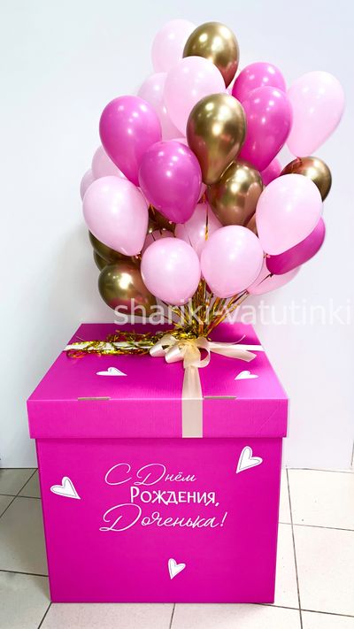 Когда коробка будет открываться, из нее поднимутся в воздух шары с гелием, а внутри коробки останется лежать подарок от Вас!