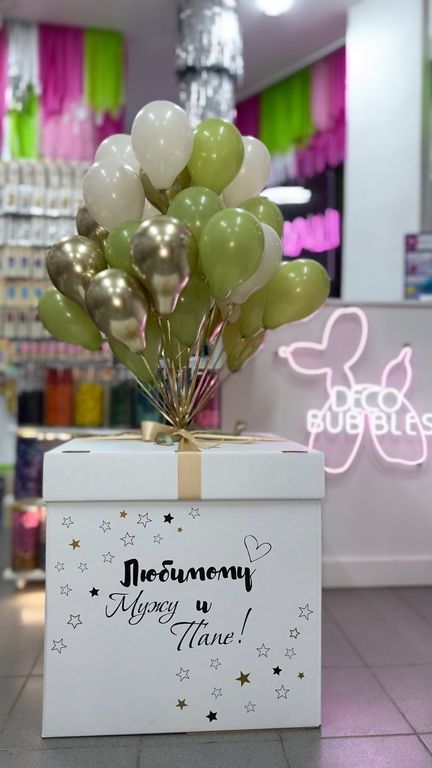В комментарии к заказу укажите цвет коробки, шаров и надпись.