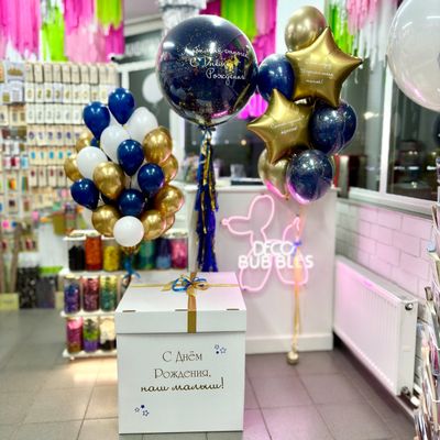 Набор на День Рождения с коробкой сюрприз, шар гигант и фонтан (синий/золото)