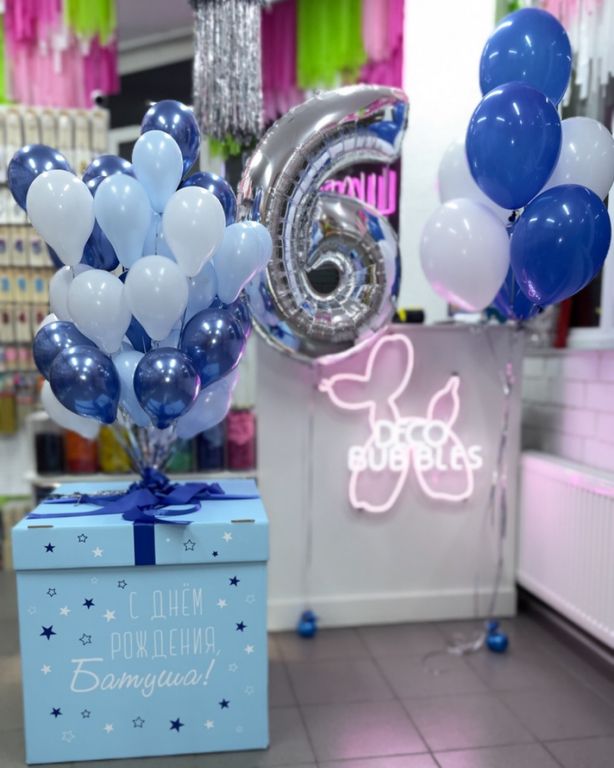 Набор на День Рождения с коробкой сюрприз, цифрой и фонтан (голубой/белый)