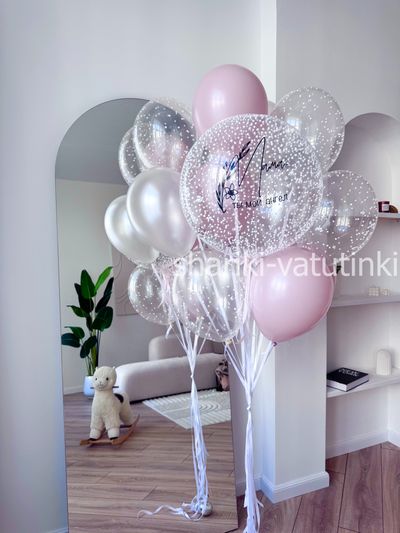 - фонтан из 13 шаров на атласных лентах (шар баблс с шариками пенопласт и надписью, 4 с шариками пенопласт, 4 жемчужный, 4 пыльная роза).