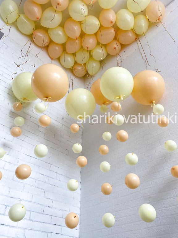 - Под потолок 30 однотонных шаров (15 персиковых, 15 нежно-жёлтых)