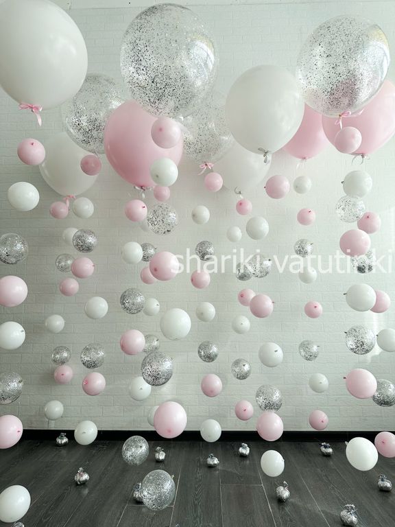 - 11 шаров цепочки с пузрями (45см) 4 с конфетти, 3 розовых, 4 белых.