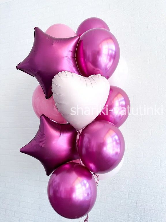Фонтан 12 шаров "Сатин фуксия звёзды"