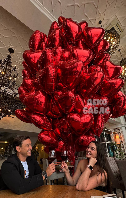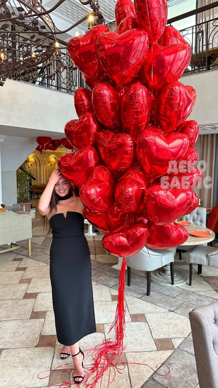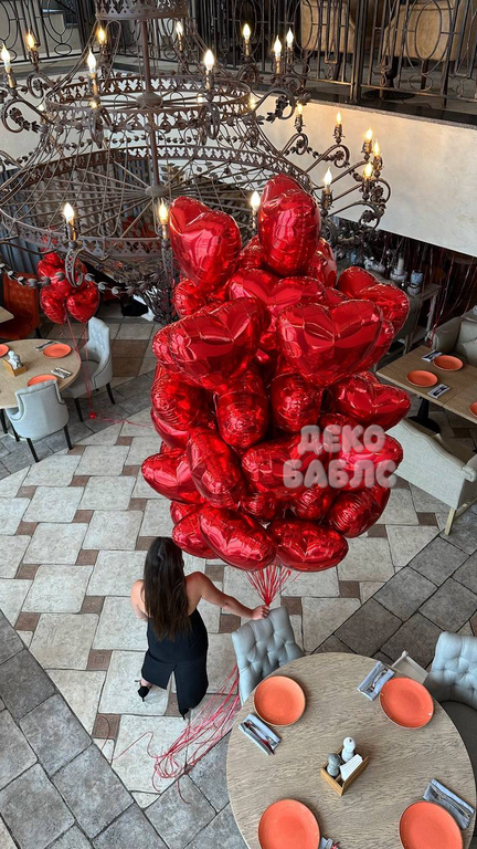 - под потолок 500 фольгированных красных сердец 45см.