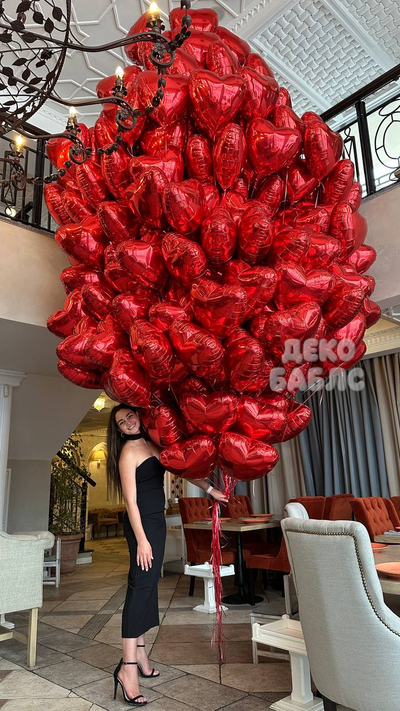 Огромная связка из 500 красных фольгированных сердец с гелием