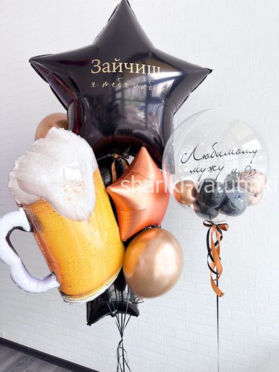 - фонтан из 10 шаров (фольгированная звезда гигант с вашей надписью, фольгированная фигура "кружка пива", 2 звезды 45см, 3 хром, 3 однотонных)