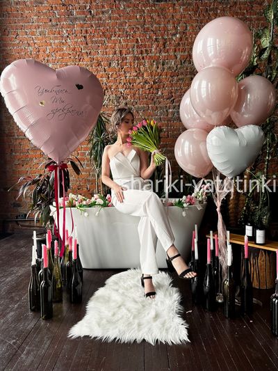 -фонтан из 7 шаров на атласных лентах (стекляшка 45см с конфетти 2шт, сердце, 3 даблстафф).