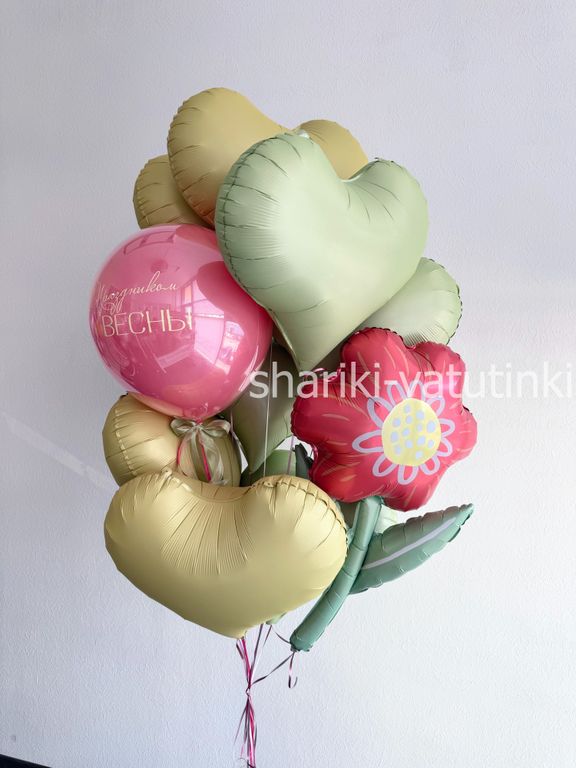 -фонтан из 10 шаров (цветок, стекляшка с надписью 45см, 8 сердец люкс).