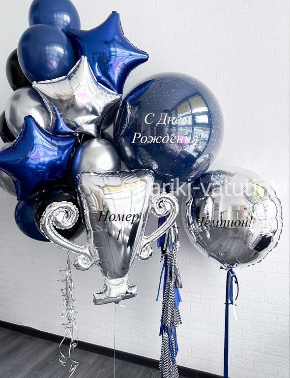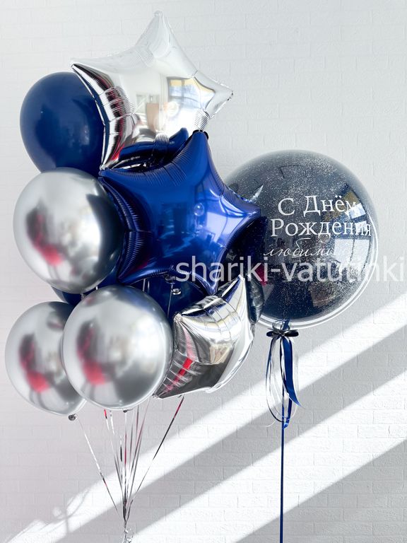 - фонтан из 17 шаров ( 5 хром, 9 однотонных, 3 звезды (45см)),