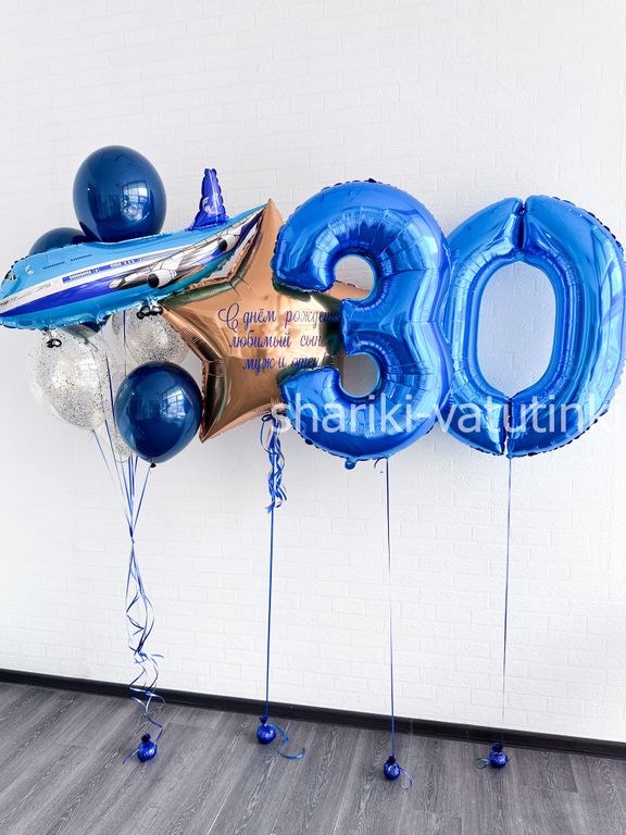 - фонтан из 8 шаров (3 даблстафф синие, 4 с конфетти, фольгированная фигура самолет),