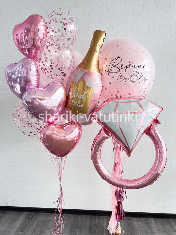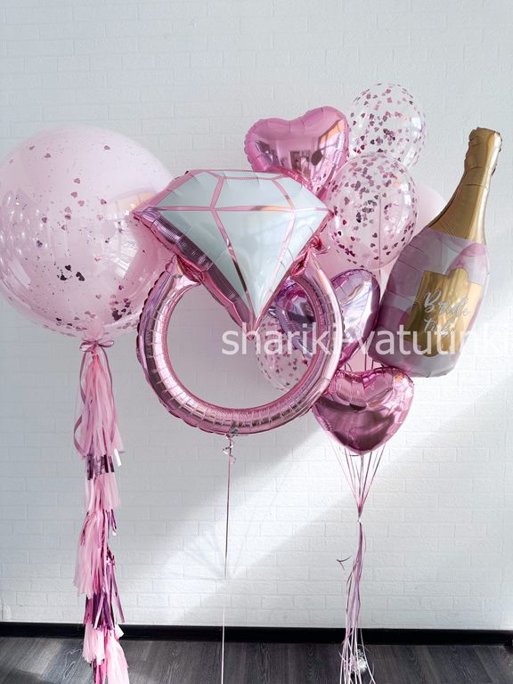- фонтан из 15 шаров ( 5 с конфетти, 5 хром, 4 фольгированных сердца 45см, фольгированная фигура бутылка шампанского),