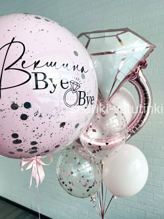 - фонтан из 5 шаров (2 однотонных, 2 с конфетти, фольгированная фигура кольцо),