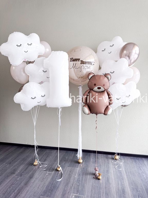 - два фонтана по 10 шаров (4 хром, 3 однотонных, 3 фигуры облако).