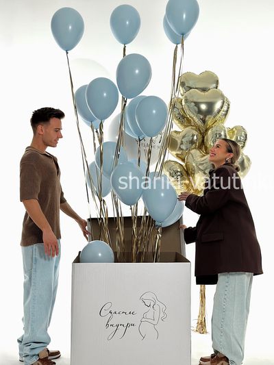 - коробка сюрприз 60см с надписью и бантом, внутри 40 мини шариков розовые или голубые;
