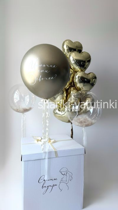 - коробка сюрприз 70см с надписью и бантом, внутри золотой гендер шар;