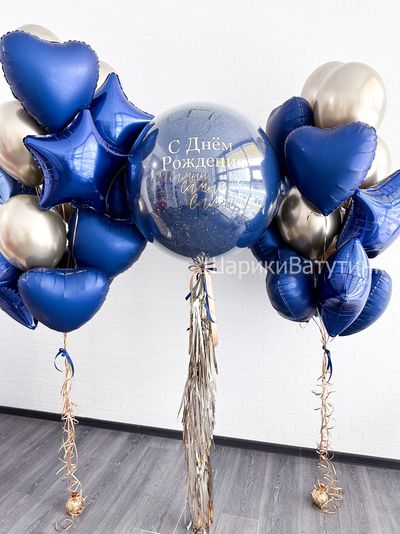 - фонтаны по 15 шаров (4 звезды 45см, 4 сердца 45см, 7 хром),