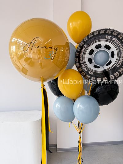 - фонтан из 15 шаров на атласных лентах (фигура колесо, 2 круга, 12 однотонных).