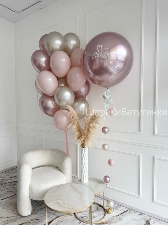 - фонтан из 16 шаров на атласной ленте (6 однотонных, 10 хром) .