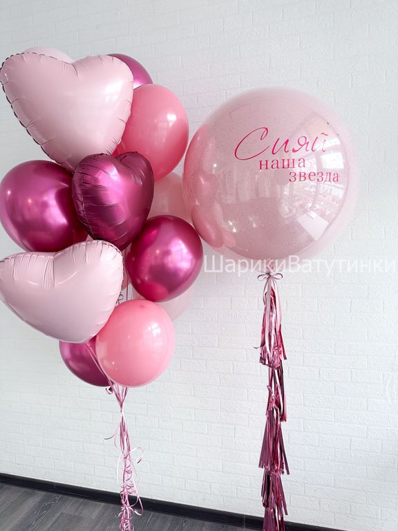- фонтан из 13 шаров (6 однотонных, 4 хром, 3 сердца 45см) .